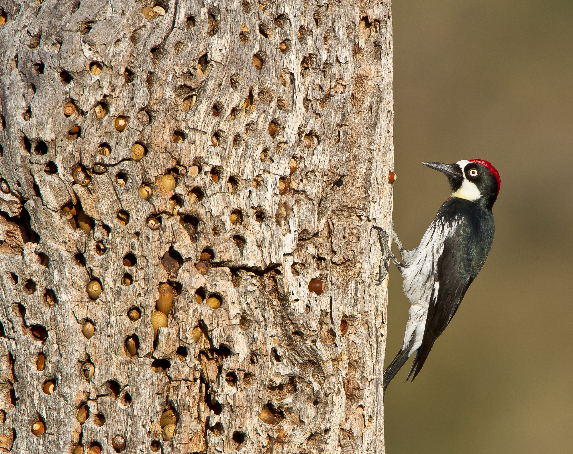 Picture this: You’re hiking through a redwood forest in Northern California, and you stumble upon a towering trunk with tens of thousands of acorns drilled into it. You might think it’s some Satanic ritual, but in reality, it’s the handiwork of an 8-inch-long woodpecker and its kin.