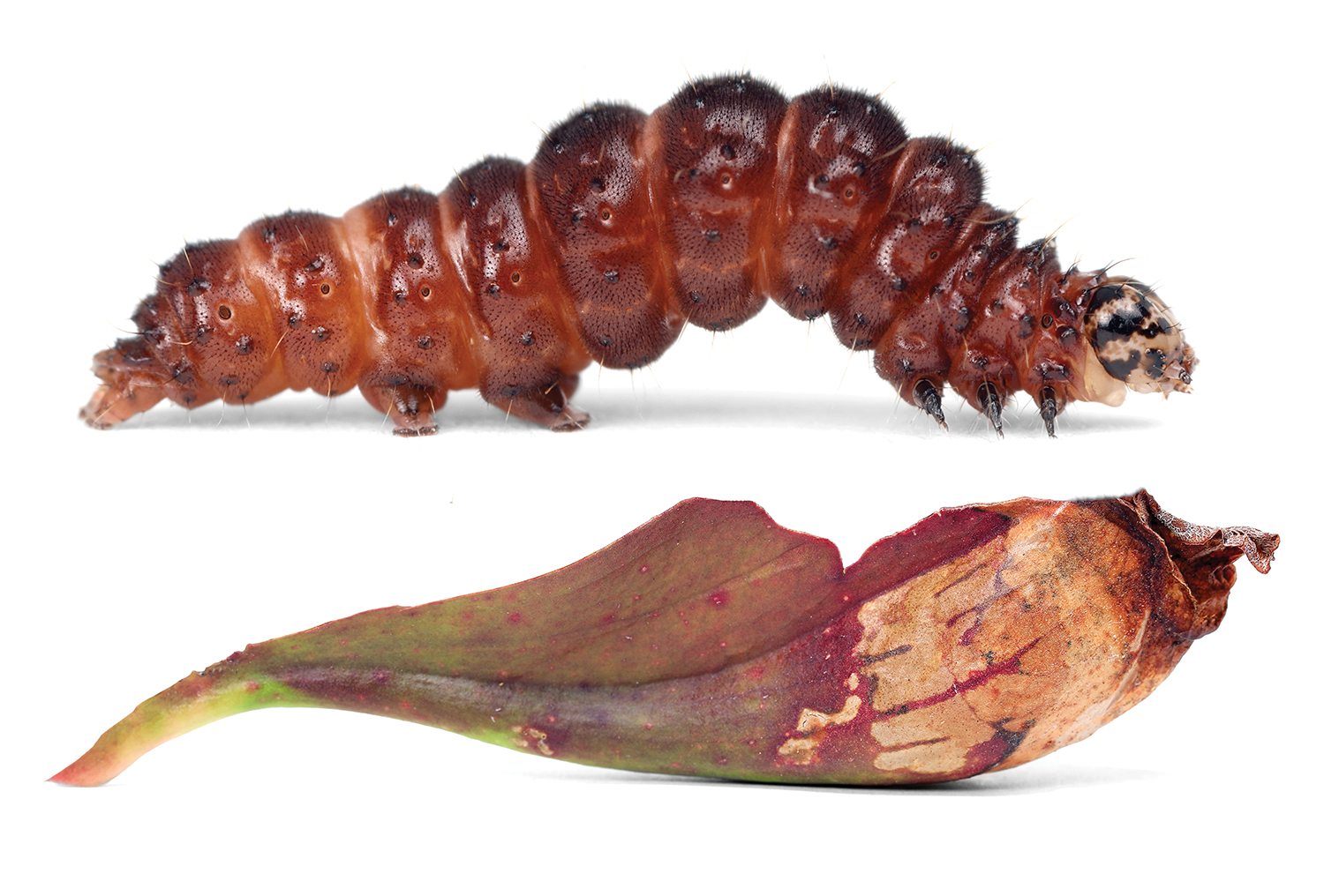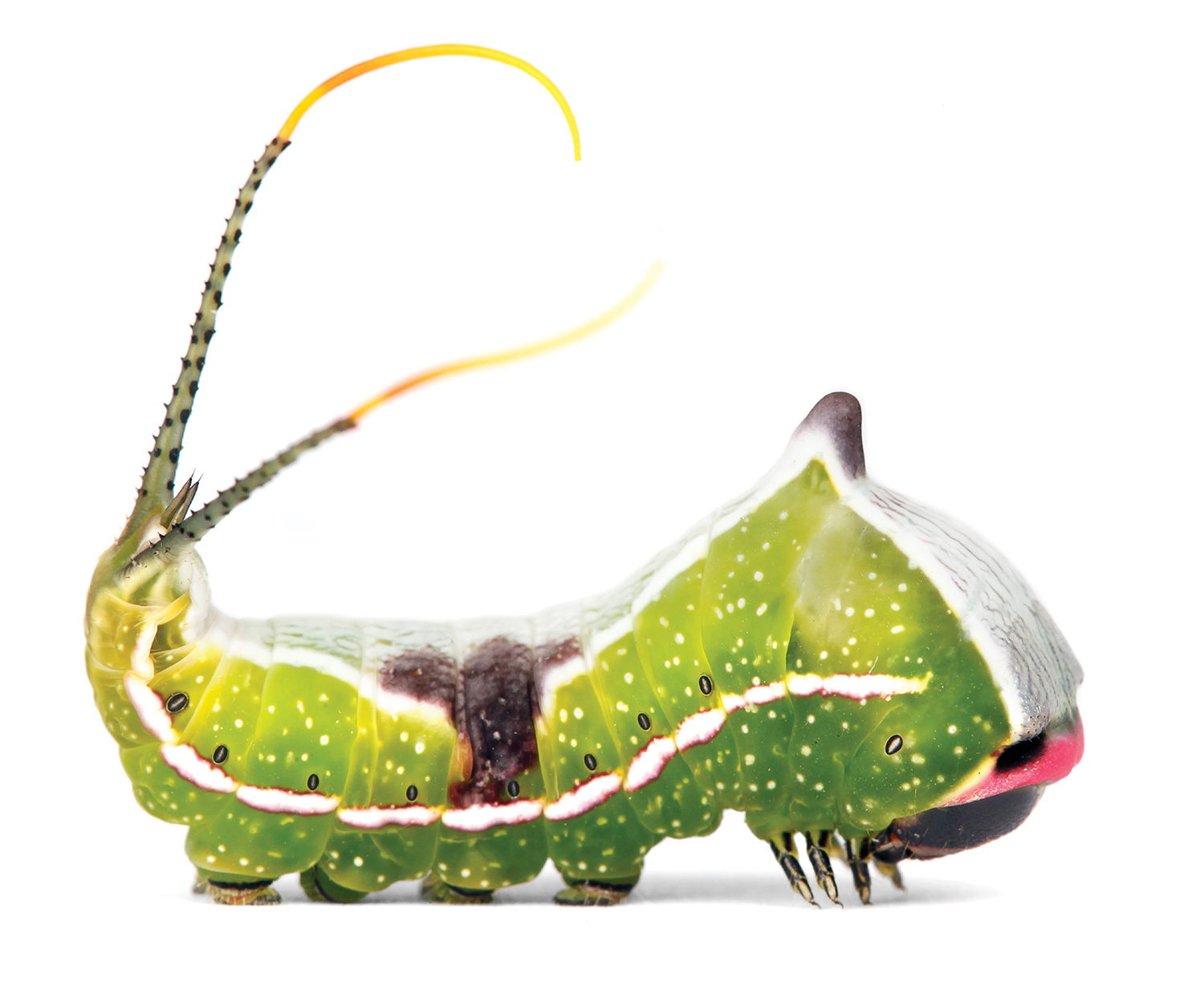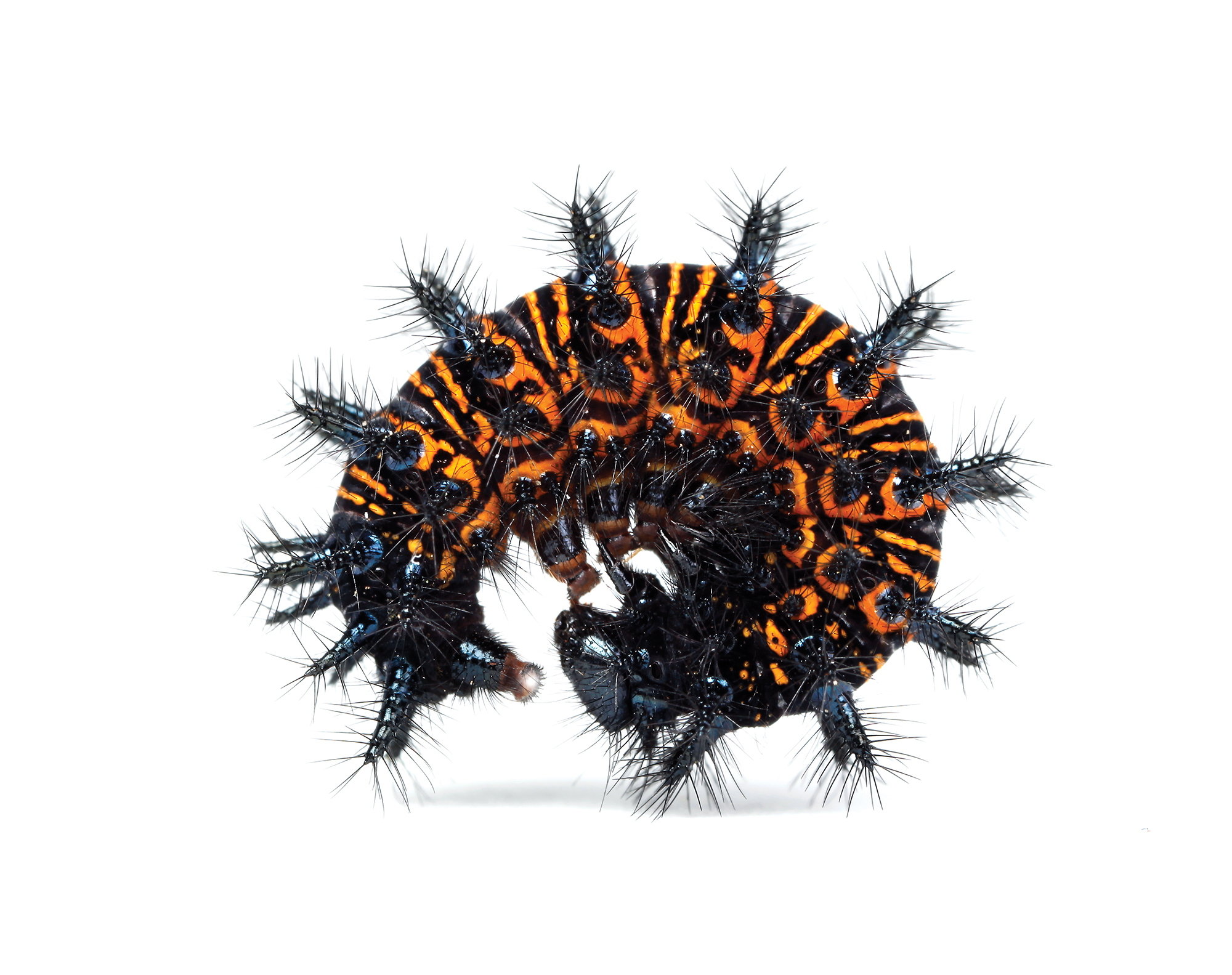 CATERPILLARS ARE masters of deception. Some imitate sticks and leaves to avoid becoming lunch. Others flash bright colors to convey their toxic nature. A few even wave pumped-up limbs to frighten foes. Despite such impressive maneuvers, humans tend to overlook these wee wonders. But they rarely escape the eye of Samuel Jaffe, an entomologist who’s spent his life uncovering their anonymous exploits, a fascination that began when he was a kid collecting the critters near his Massachusetts home. Before long, Jaffe started photographing them. In 2013, that project blossomed into the Caterpillar Lab, an education center in New Hampshire with thousands of live specimens. The nonprofit’s scores of caterpillar close-ups provide a fascinating glimpse of the secrets hiding in backyards everywhere, just waiting to be found.