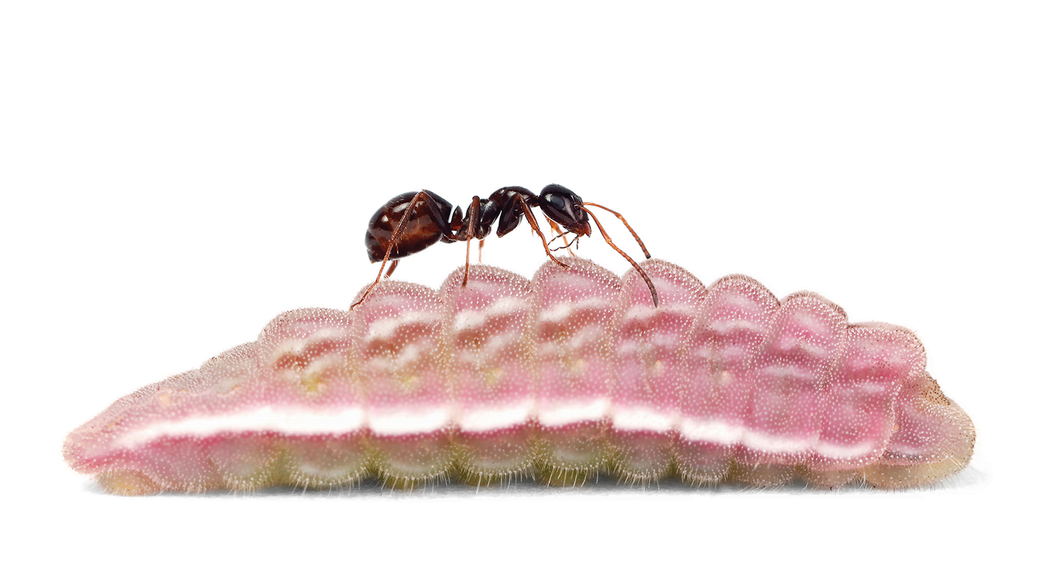 The young Glaucopsyche lygdamus, which will become a cerulean butterfly, defends itself against wasps and other threats with a security detail of ants. Some varieties of the species feed their guards sugary drops to keep them around. Others excrete a cocktail of chemicals that makes the trusted servants abandon their queen and colony.