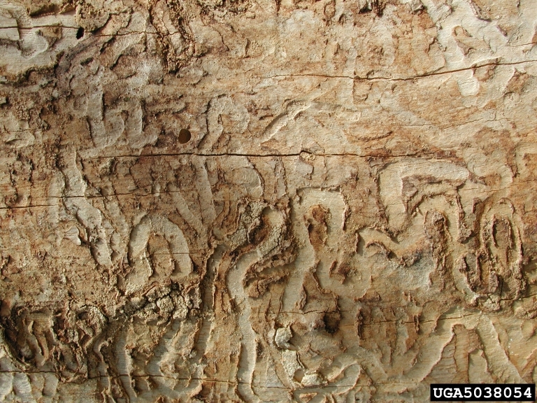 Researchers believe the emerald ash borer likely arrived in the U.S. on imported wood packaging material from Asia sometime in the 1990s. The insects lay eggs in the bark crevices of ash trees; when larva hatch, they tunnel through the bark and feed on the inner layer of the tree. Their impact becomes apparent when the bark is peeled back, revealing dramatic feeding tracks. These channels damage the trees’ vascular tissue – internal networks that transport water and nutrients – and ultimately kill the tree.