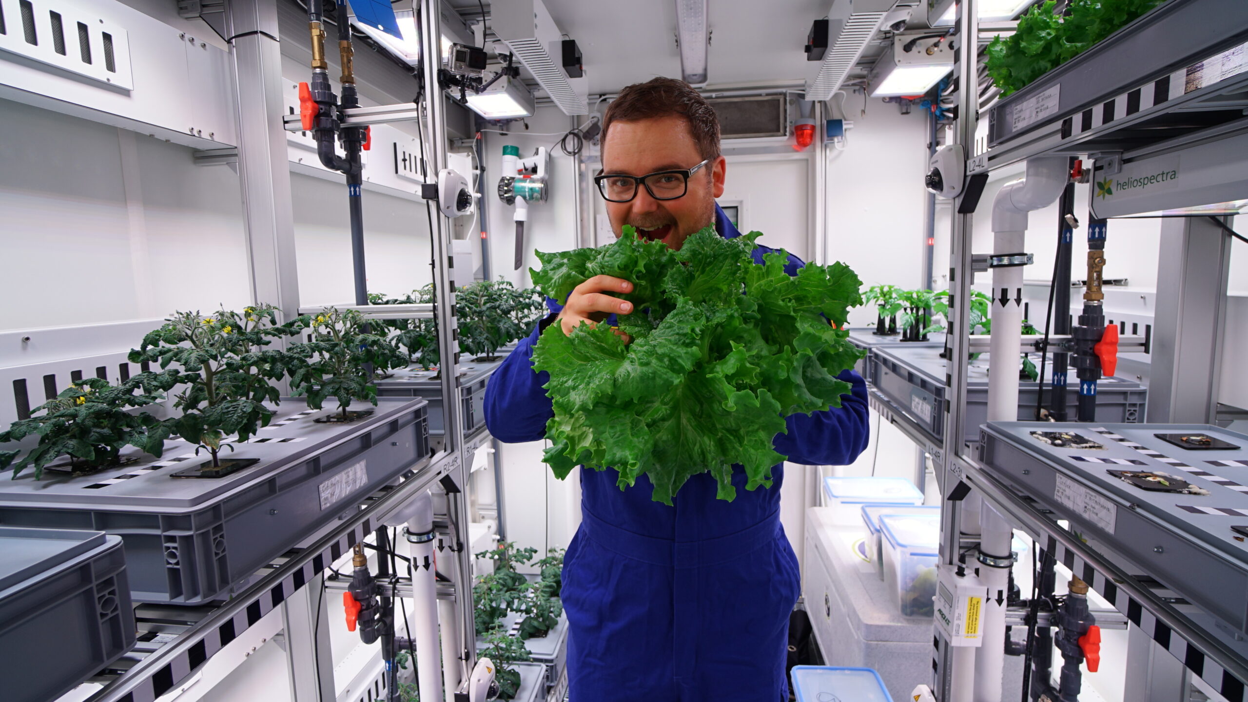 Just like it would have to on the ISS or the Moon, the greenhouse is designed to be totally independent of its environment and run on an aeroponic model. The plants are nourished by a liquid nutrient solution instead of soil, and by specially designed LEDs in lieu of sunlight. “We are also adapting the air in the greenhouse to meet the needs of the plants as much as possible,” DLR spokesperson Daniel Schubert explained in a January 2018 press release. That means increasing the amount of carbon dioxide in the air, and keeping that air clear of bacteria and mold with special filters and a UV radiation disinfection process. In this way, Schubert said, “purely biological growth is possible without insecticides or pesticides.”