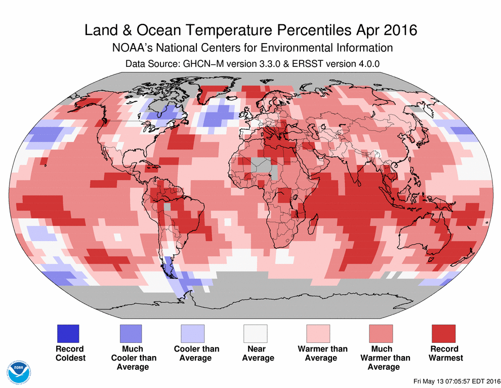 The average global temperature across both land and seas during April was 1.98°F higher than the 20th century average. In the Northern Hemisphere (where spring had just begun) the snow cover was the smallest April snow cover extent in the 50-year period of record, and 890,000 square miles below the 1981 to 2010 average.