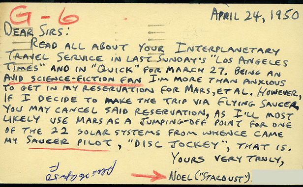 Another applicant named Noel wanted to go to Mars, but he wasn’t about to wait around for scientists. He wrote, “If I decide to make the trip via flying saucer, you may cancel said reservation.”