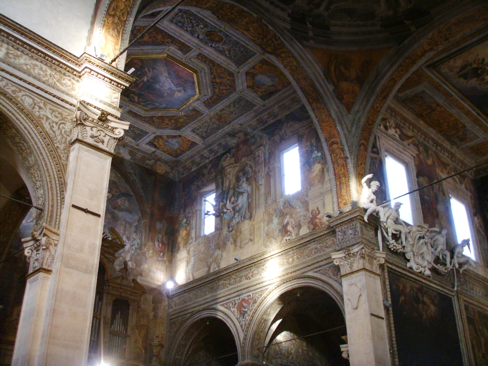That setting turned out to be a five minute walk from campus. In 2012, northern Italy suffered two earthquakes in nine days. Many of Ferrara’s buildings sustained structural damage, the church of Santa Maria in Vado among them. Bononi’s painting of the Virgin Mary being crowned on her ascent into heaven was removed from its previous spot in the ceiling and placed on the floor of the church, awaiting restoration ever since.