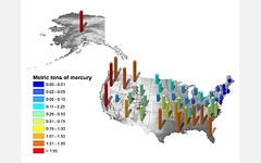 The map at left shows the annual average (in metric tons) of mercury, a toxic metal, released into the atmosphere by fires. The estimates are based on fires from 2002 to 2006.