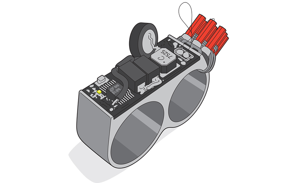 Sean Hodgins enjoys ring smithing, a hobby he adopted from his grandpa, and loves building small electronic gadgets. So he combined his passions to make a ring that turns body heat into light. Hodgins milled a two-finger band out of aluminum—an excellent thermal conductor—to cradle a 6-millimeter by 3-millimeter Peltier module and custom circuit board. The Peltier module converts heat flowing from the ring into a small voltage, and the circuit board amplifies the current. For now, cold weather best illuminates an LED on the ring, but Hodgins is designing a new circuit to make it blink brightly at any temperature.