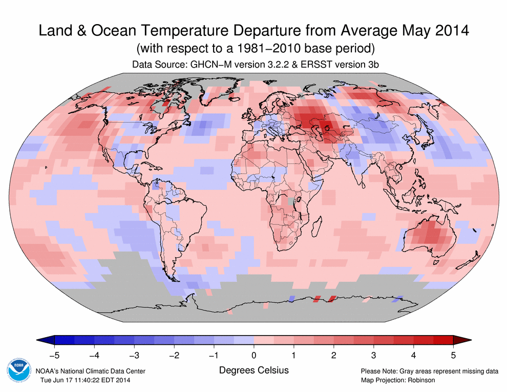 - The average temperature over land and ocean combined in May 2014 was 1.33 degrees Fahrenheit (0.74 degrees Celsius) higher than the 20th century average of 58.6°F (14.8°C)