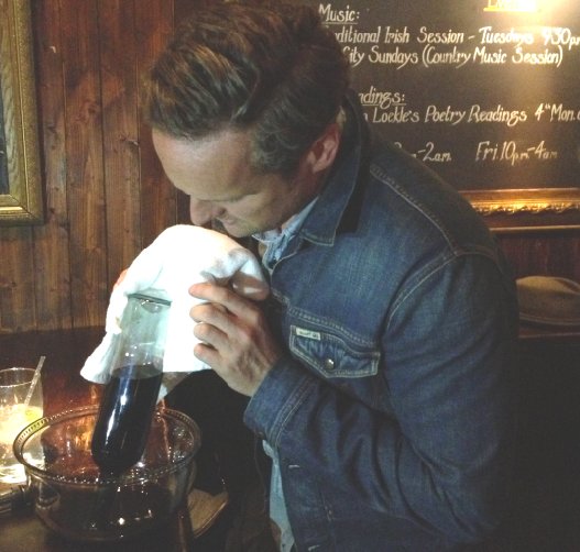 Shaw puts some whiskey in a 20-ounce plastic bottle, and then pumps it up a few times with a bicycle pump. The connection between the pump and the bottle must be air-tight, which Shaw achieves with a rubber stopper. Once he releases the seal, a haze of whiskey and water appears inside the bottle. This whiskey fog can then be inhaled. (It may be okay to do this once or twice, but inhaling alcohol in general is dangerous.)