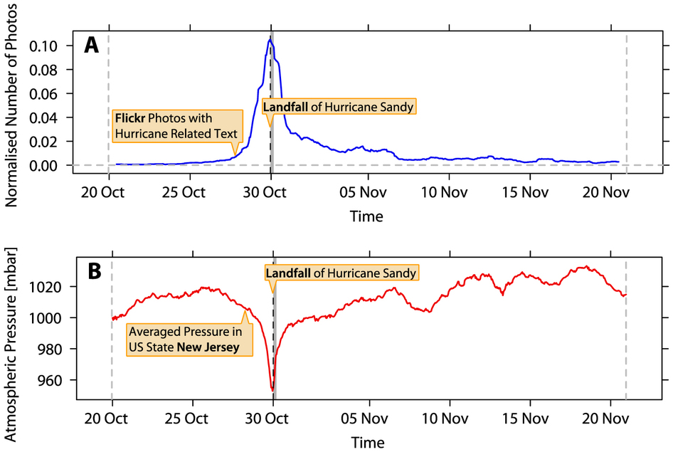 During Hurricane Sandy, people took to the streets (or at least peeked out the window), documenting the storm on social media, uploading images and updates of the destruction. On Flickr, a new paper in Scientific Reports finds, the rate of those uploads mirrored the swift drop in atmospheric pressure in New Jersey as the hurricane made landfall.