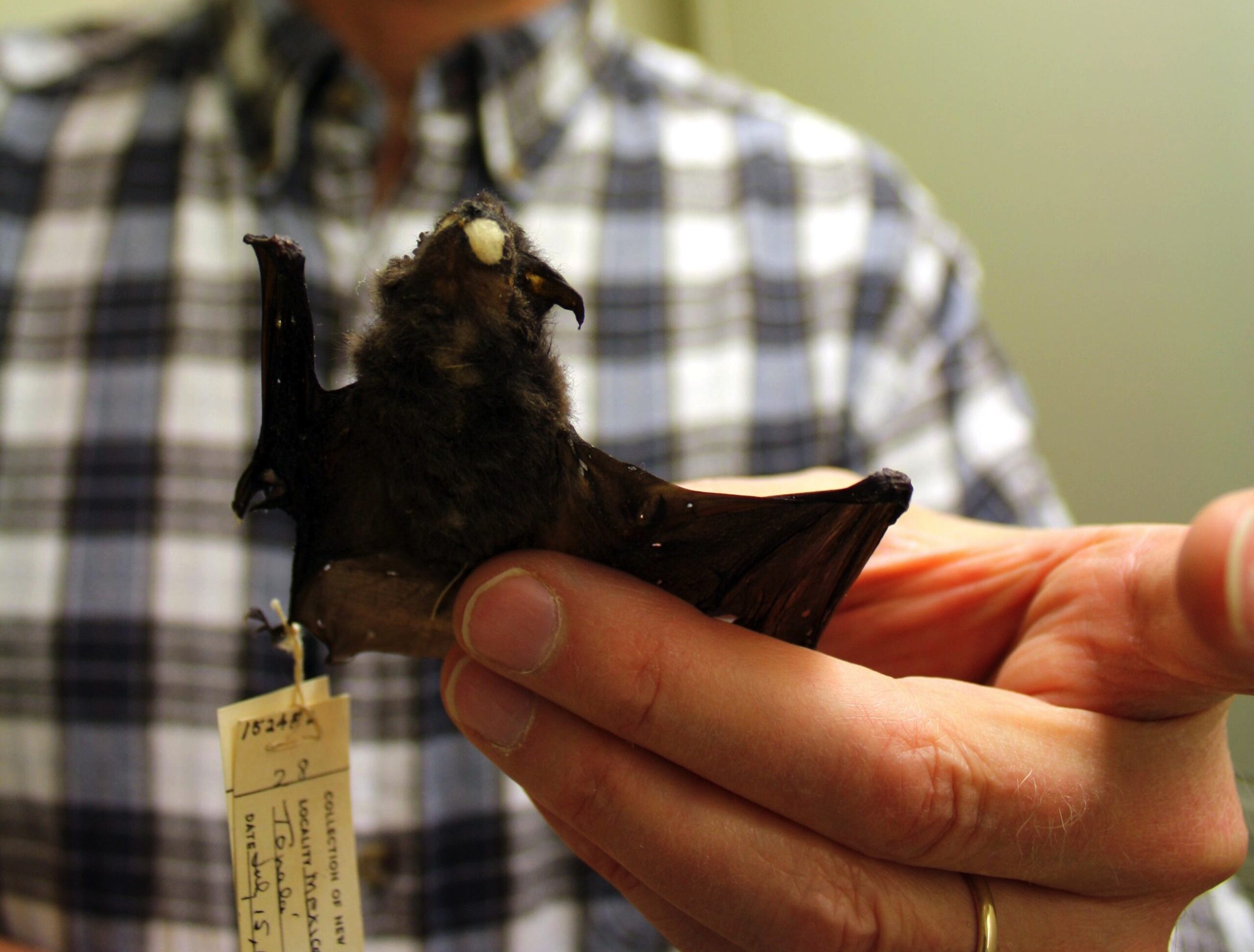 Many bats were netted in rainforests, or plucked from the roofs of caves like strange fruit. Occasionally, bats were simply shot from the sky. Browsing through the drawers, one still can find specimens that were brought down with birdshot, pellet holes in the dried papery skin between wing bones.
