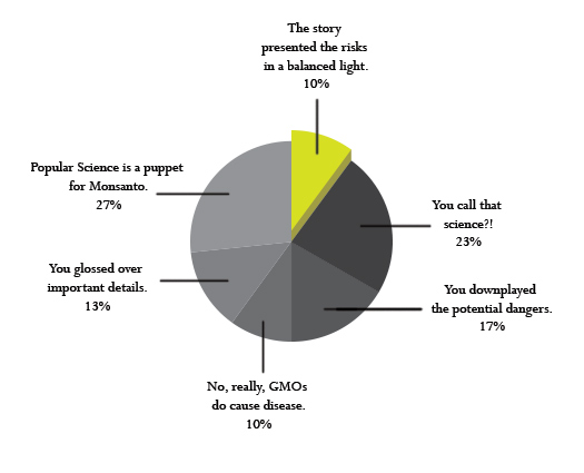 We were not at all surprised that “Core Truths,” our July feature about genetically modified organisms (GMOs), garnered a large response—nor were we shocked that much of it was critical. We don’t have the space here to do your dozens of letters and emails justice, but here’s a breakdown of reader opinion: