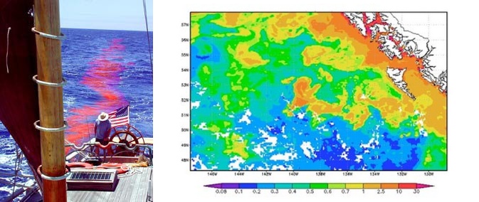 Iron causes blooms of plankton to form because the element is required for the tiny plant-like cells to live, and is usually only present in small quantities at the surface. Places with strong upwelling currents–such as areas off the U.S. West Coast–often have higher levels of iron brought up from the deep ocean, and for that reason often have abundant plankton and sea life. George’s idea was to create this bloom to both absorb carbon dioxide (the plants need this greenhouse gas to grow) and to provide food for local salmon stocks. After the tiny cells capture carbon dioxide as they’re growing, they eventually sink to the bottom and die, removing the gas from the atmosphere.
