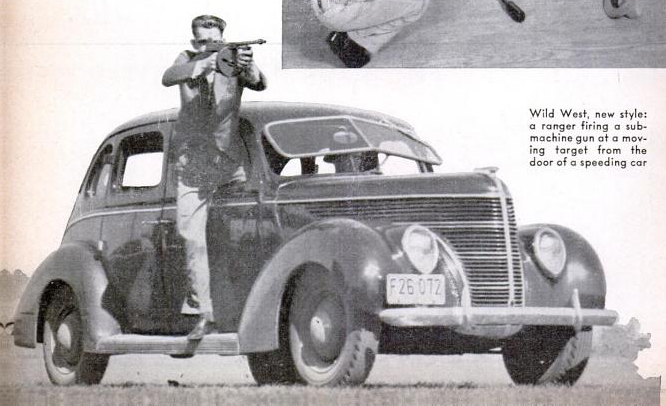 One of our reporters spent some time with the Texas Rangers and noticed some interesting changes in the frontier force. The days of firing revolvers from galloping horses were gone—replaced by sub-machine guns fired from a speeding car.