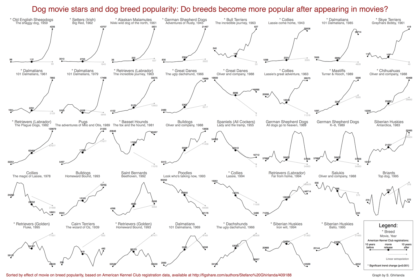 The authors used the records of the American Kennel Club, which has been recording the numbers of registration for each dog breed since 1927, and keeps the largest such dog registry in the world. Looking at the effect of films released between 1927 and 2005, the study shows that the number of registrations of a particular breed rose significantly following the release of a film in which the breed had been featured.