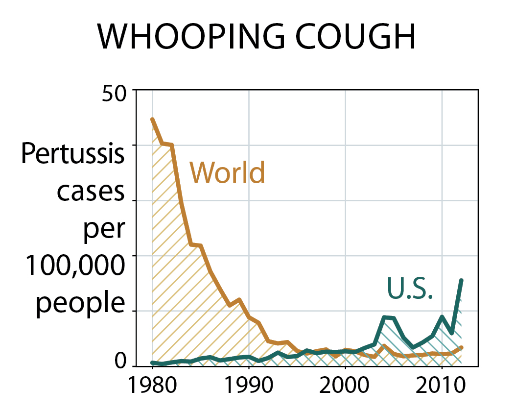 Cases of pertussis, or whooping cough, have climbed in the U.S. for several reasons. For one, the vaccine adopted in the 1990s wears off faster than the previous vaccine did. Better diagnostic tests in the U.S. may also contribute to the higher prevalance.