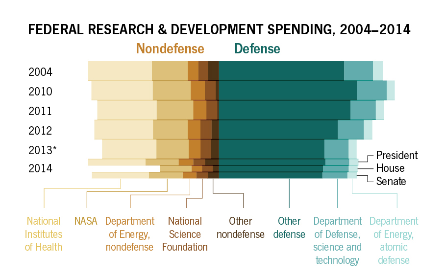 *Science-budget data courtesy American Association for the Advancement of Science. All amounts are adjusted for inflation. Figures for 2013 are estimates, and those for 2014 are proposed budgets. Not included is the House 2014 allocation for the National Institutes of Health, which hadn’t been released when this issue went to press.