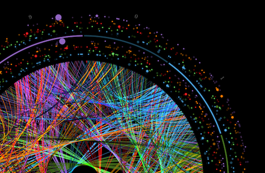 The original image by Crisitian Ilies Vasile used a circos diagram, a format developed by Krzywinski for genetics visualizations. In his version, Krzywinski uses color pairs from a Brewer palette, which are designed for maximum readibility.