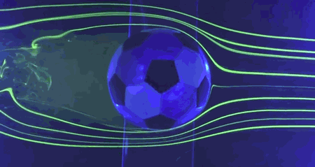 Of course, spinning the ball changes its aerodynamics. Here’s NASA’s demonstration with a typical soccer ball in a water-filled chamber (The green lines are created with dye):