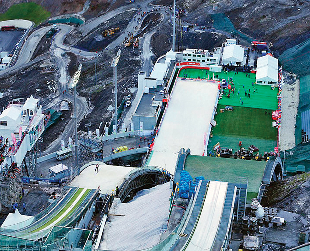 In 2013, workers pushed about 28 million cubic feet of artificial and natural snow into massive piles and covered it with thick reflective blankets to reduce melting. Snow from these reserves, located high in the Caucasus Mountains, can be transported down to the ski jump as needed.