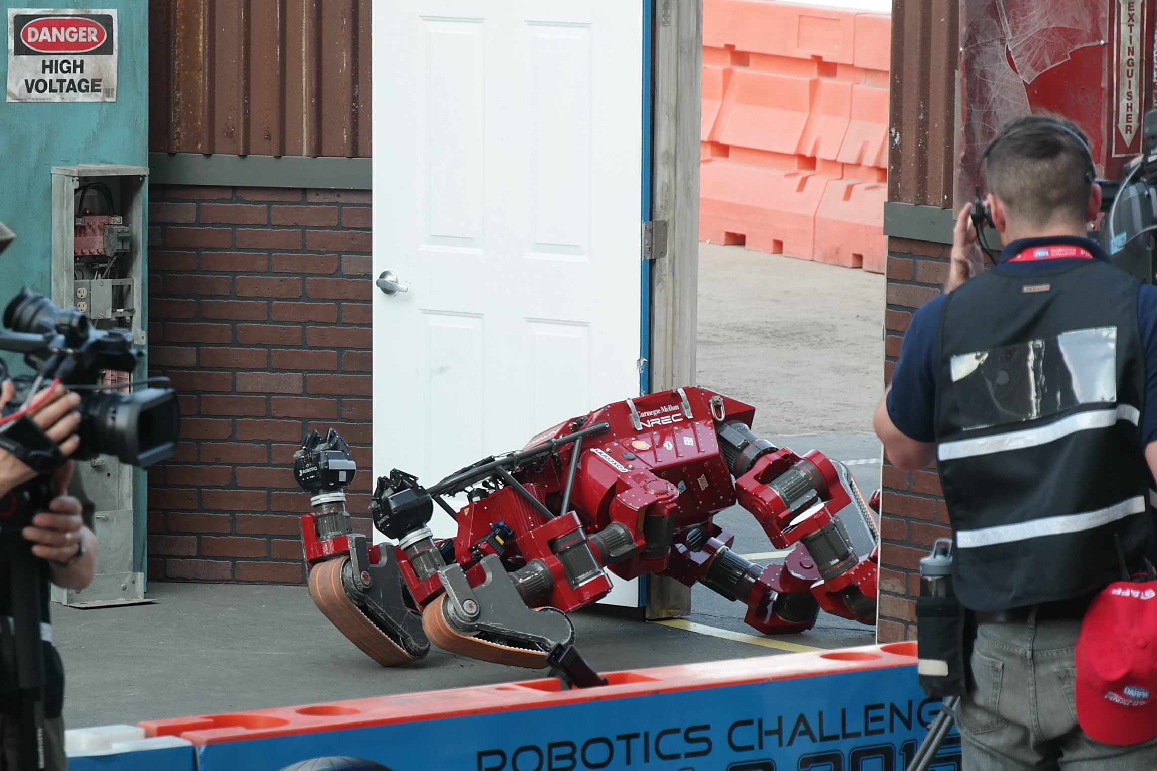 The primate-inspired robot from Carnegie Mellon University delivered the DRC’s most electric run so far. It drove down the dirt track with impressive speed, but was then inexplicably slow to get out—or “egress,” in DRC-speak. Finally, CHIMP opened the door, and the impossible happened. CHIMP ate it, sprawling onto the floor halfway through the doorway (as seen in the photo above). The robot that seemed incapable of falling, that we (and others) constantly described as being essentially fall-proof, because of its stable posture and use of tracks instead of two-legged walking, had gone down. Normally this would call for a “reset,” as humans hoist the robot back to an upright position, and DARPA officials add 10 minutes to its time. Since each machine has a maximum of one hour on the course, and most need more than that to attempt every task, resets are devastating.