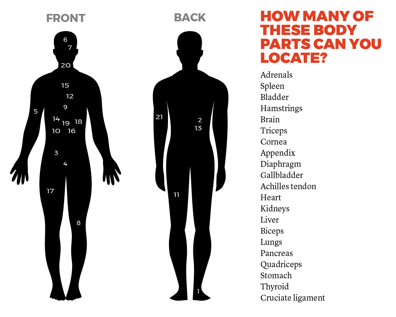 The only anatomical part that 100 percent of people got right was the brain. Only one in five knew where the spleen went, and just one in four could identify the gallbladder’s home. And laugh all you want, but the average person probably couldn’t tell you where the spleen is. Just see for yourself. We put together a labeled diagram of all the body parts that the participants were asked to identify. Go ahead and write down numbers 1-21 and see if you can match the numbers to the organs. And keep in mind that for the actual study, volunteers were given a totally blank body map and asked to show where each part went, which is way harder.