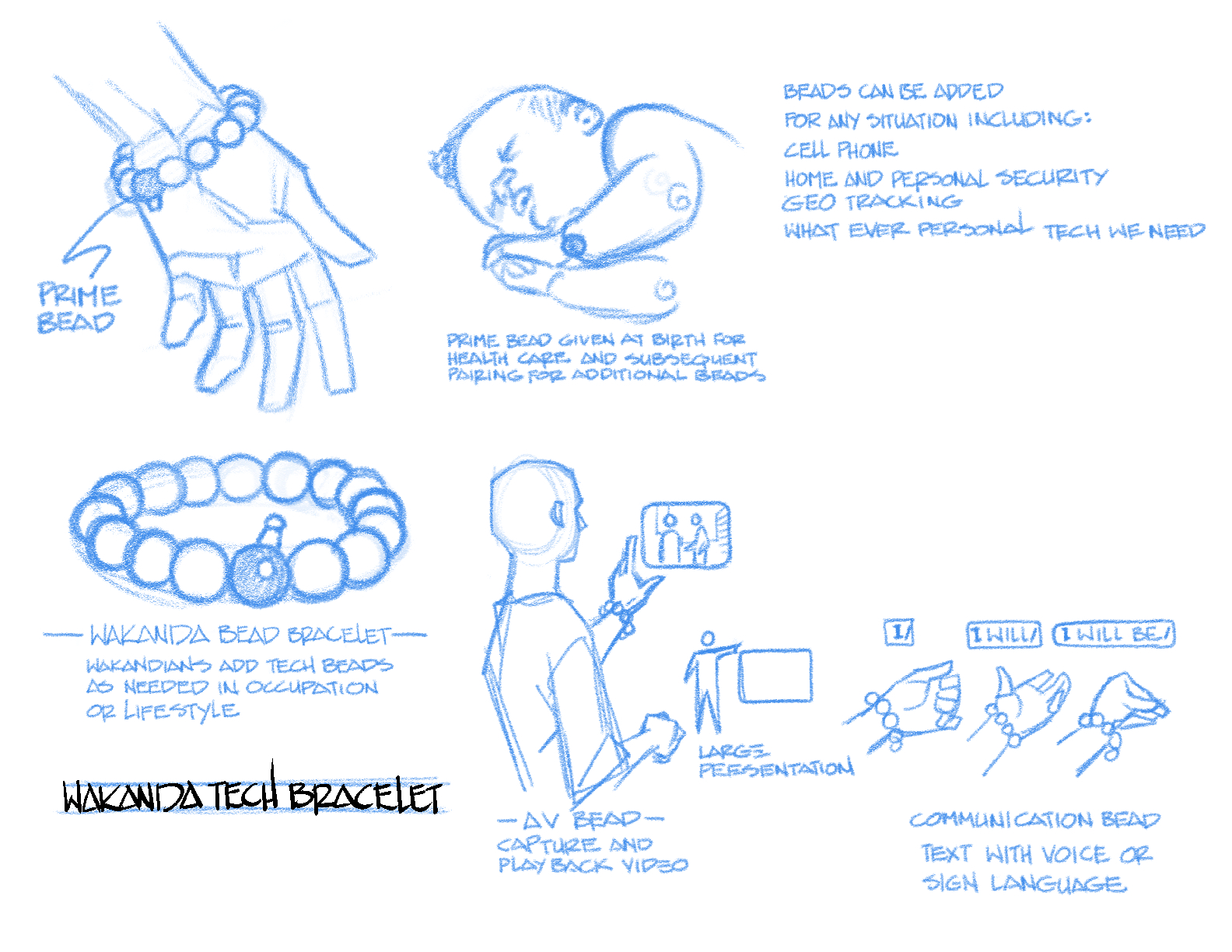 The bracelet started off as a way to tell some of the backstory without doing a flashback. Instead of cutting away from the actual story, we’d have someone pull up a screen of what they’re talking about instead. A bead act as a cell phone, but from there we thought about the other beads: what if another bead is their personal data, holding medical records and such. What if a separate bead is GPS? If you work a certain job, you’d get a bead tied to the machines of that workplace.