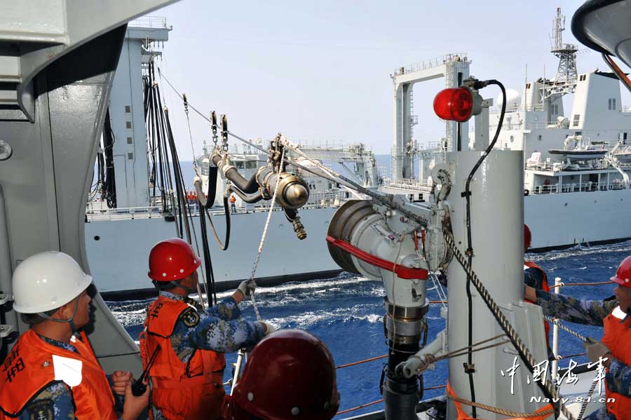The Type 903A, an improvement of the Type 903, can carry over 10,000 tons of fuel to simultaneously refuel two other ships. The Alongside Connected (ASC) method of replenishment that the PLAN uses requires a high level of naval skill to maintain coordination: warships must sail alongside the replenishment ship at 12-16 knots, with only 30 yards of distance. The replenishment ship then launches cables to the receiving ships, those cables help guide and connect fuel lines and zip lines that sling across dry cargo like rations and ammunition. The Type 903A also carries two Z8 helicopters to airlift larger sized cargo like machinery spare parts.