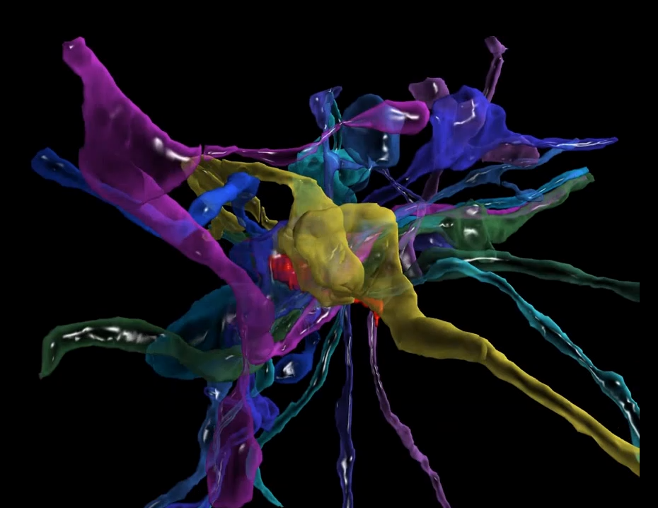 To see if the application would actually work, the researchers chose to visualize parts of a mouse’s neocortex–the area of the brain that receives sensory information from mouse whiskers, which are even more sensitive than human fingertips. They first took EM images of the structure, combined them, then, using VAST, they assigned different colors to piece apart the individual structures and cell types, allowing them to see each type individually and how they come together to create the brain structures. In the video below, they use color coordination to reconstruct the structures that surround two dendrites–the tree-like branches of a neuron that receive sensory information from other neurons. The objects are initially shown as they would appear in the brain. Then, they are sorted by category–axonal, dendritic, or glial–then further by functional type–excitatory or inhibitory for axons and dendrites and when applicable, by type of glial cell.