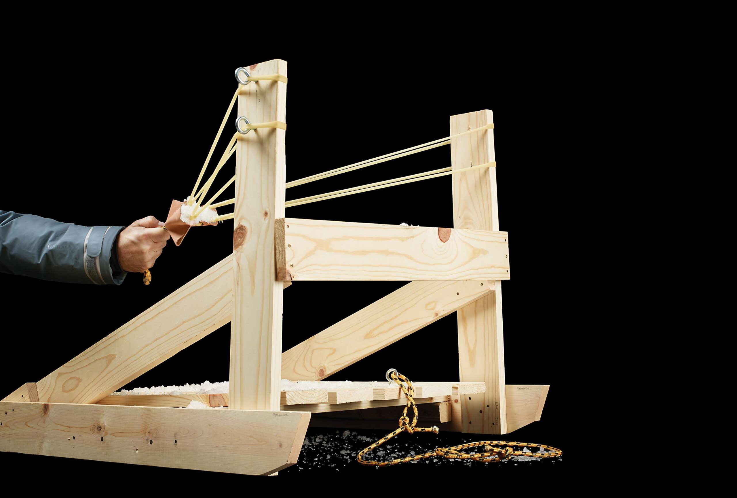 Flexible rubber tubing acts as a powerful tension spring for flinging ammo, while a mid-weight sled forms a steady base to stabilize the contraption. Don’t want to turn a perfectly good sled into a weapon? You can easily construct your own base from standard dimensional lumber using simple hand tools.