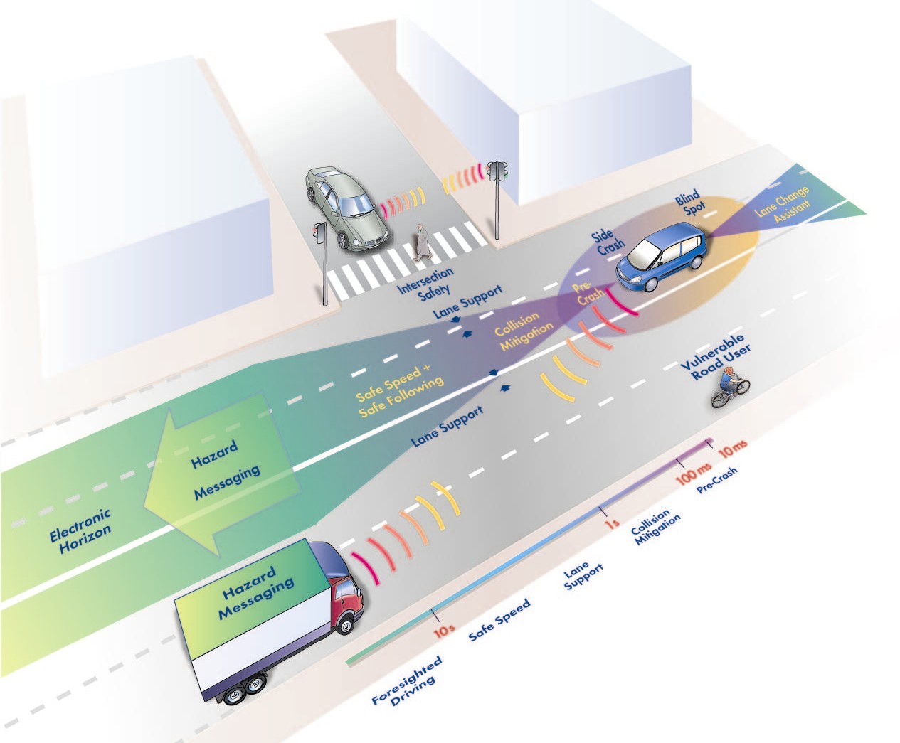 The latter two projects involve the use of predictive technologies to detect impending collision with other motorists, pedestrians and cyclists, tracking their speed and paths. If one vehicle suddenly stops, or a person suddenly steps onto the road, a car equipped with these technologies would calculate the implications and react accordingly.