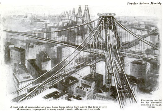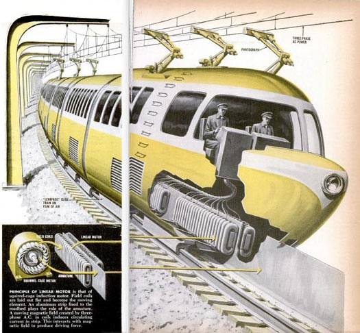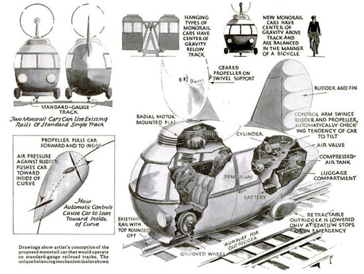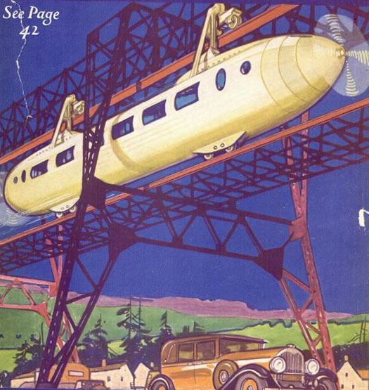 If there’s one thing Popular Science has taught me about retrofuturism, it’s that even the most improbable ideas never die. They crop up, go dormant for twenty years, and reappear once a new generation of visionaries grows tired of the status quo. Take, for example, the super speedy, aero transit monorail. In 1919, a French inventor proposed combining an airship, a fuselage, and a train to create a propeller-driven monorail with wings. We were interested, but skeptical that it could actually reach 150 miles per hour without using wheels. Eleven years later, a Scottish inventor built a similar train, but with an overhanging rail instead of wings. We were excited for awhile, but got distracted by magnetic levitation. In 1972, long after Japan unveiled its Shinkansen trains, we began to suspect that it’d be decades before we could implement that technology. So we began dreaming of hanging trains again, but this time, minus the propeller.