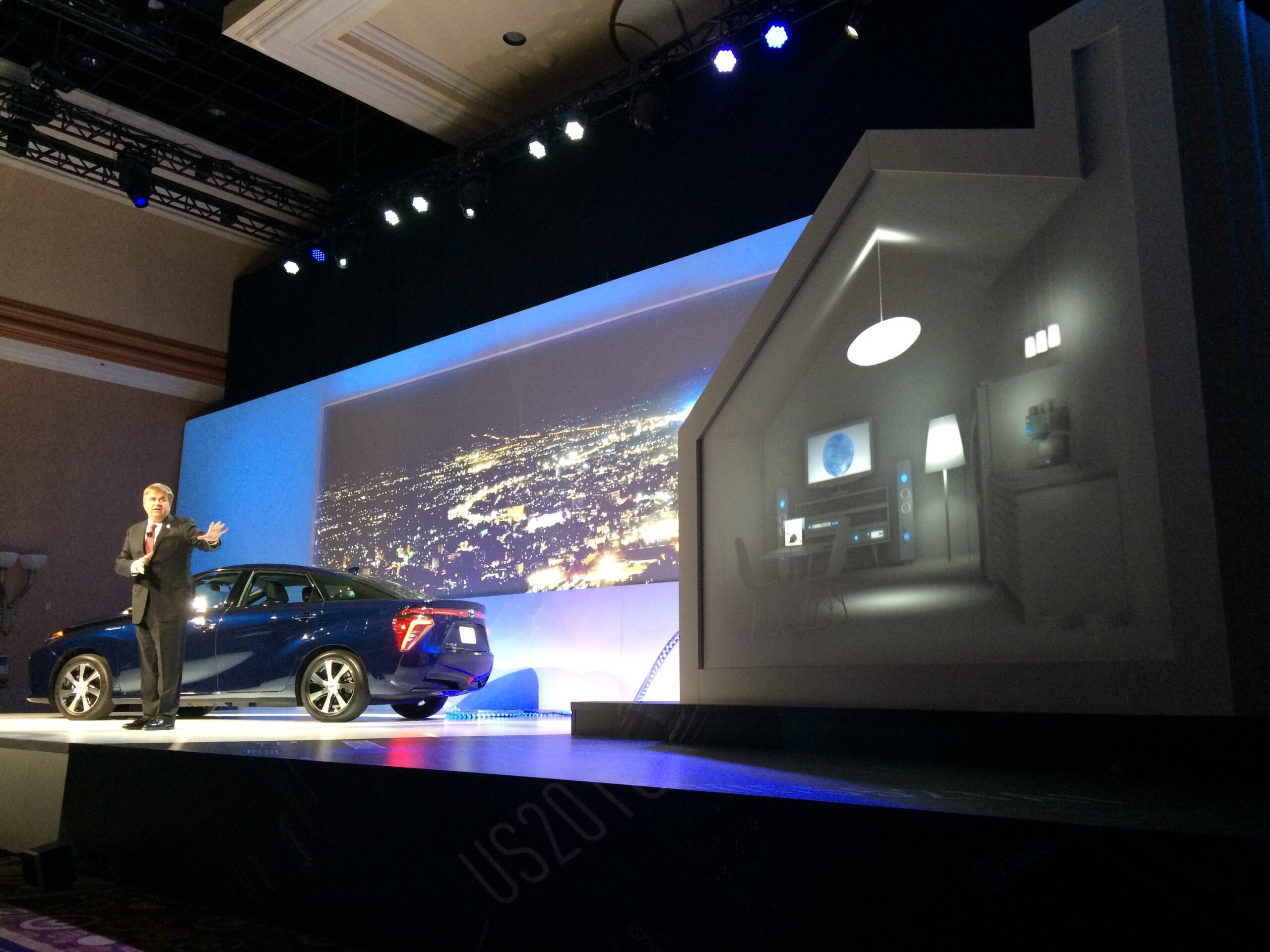 Carter then pulled a large lighted power cord out from behind the Toyota Mirai that was on stage and plugged it into the car’s power port, after which the lights came back on.