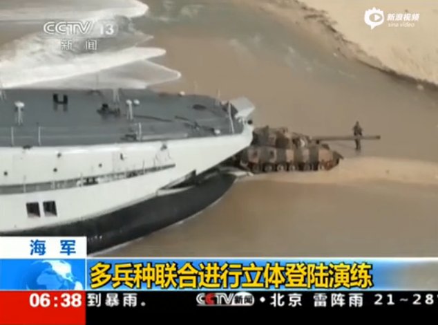 Yuyi LCACs are just as important. While Type 05 IFVs provide the first wave of troops to take the beachhead, the 60 knot, 60 ton payload Yuyi, a 21st century answer to the Higgins Boat of “Operation Overlord” fame, carries the bulk of infantry needed to exploit the breakthrough on the beach. During the exercise, the Yuyi blitzed out of the Type 071’s well deck and onto the relatively safer beach after the initial landing, unleashing a company of PLAN marines.