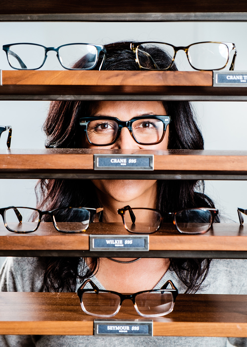 After grabbing some more traditional portraits Sorensen asked Kumar if she’d mind sliding behind the rack so that the glasses on her face would look like a pair of glasses on the shelf.