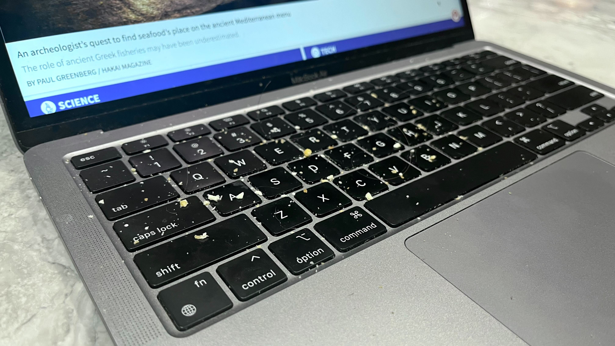 With a good grip, stand over a garbage can and carefully turn your laptop or keyboard completely upside down. Then, gently shake your device so any dried-up crumbs or pieces of food will fall out, thanks to the handy force of gravity. This debris removal is an important early step because it gets the big, bulky stuff out so it won’t get in the way of your more precise scrubbing later on.