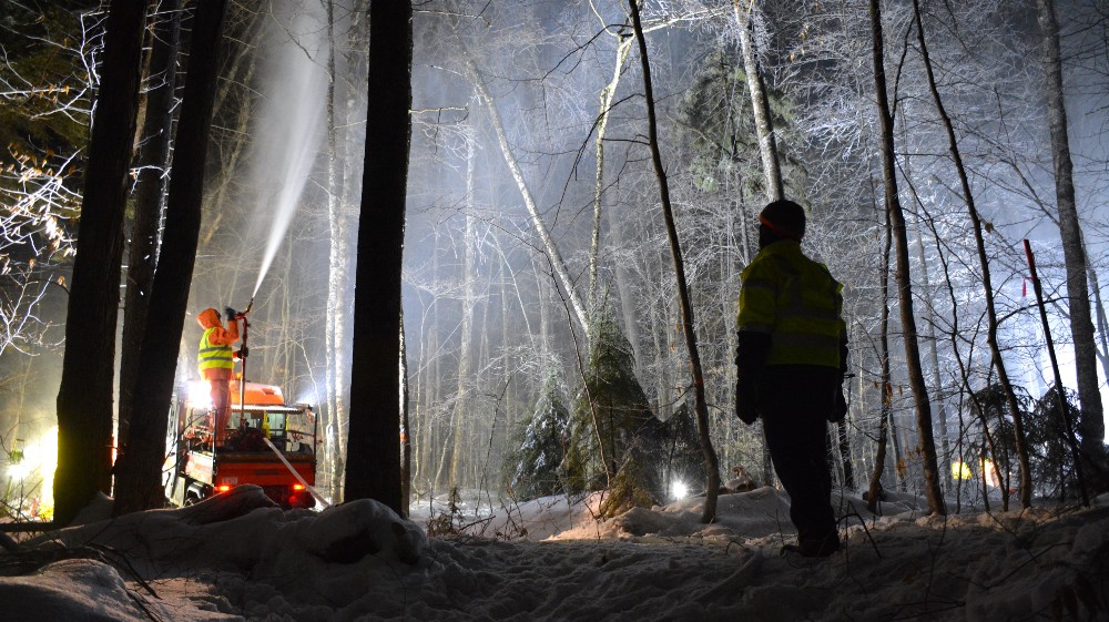 How did it work? In one of the more recent field experiments, which took place during the winter of 2016, the team waited for temperatures to dip into the 20s (Fahrenheit) for several days. More than two dozen people then drove snowmobiles up three miles of snow-covered roads into the forest, starting at about 4 p.m. Warmly clothed and wearing reflector vests, equipped with sprayers and hoses, headlamps and LED lights, they sprayed all night, four hours a plot, two plots a night. It took four nights.