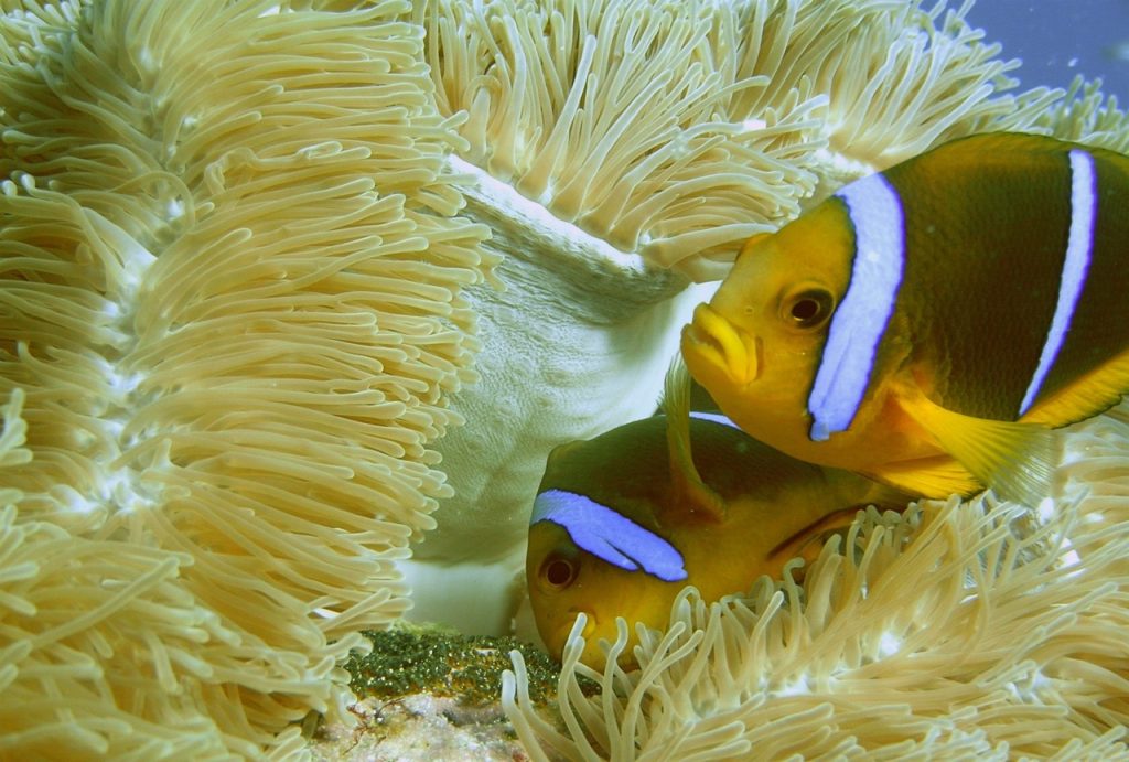 But while sea anemones generally eat fish, they don’t eat anemonefish. The clever clowns coat their bodies in a mucus that stops anemones from recognizing them as dinner. As a result, anemonefish use anemones as shelter, where they hide from predators who are more prone to a venomous attack. In exchange, the fish scares away anemone predators like the butterfly fish and turtles (they go for the eyes).
