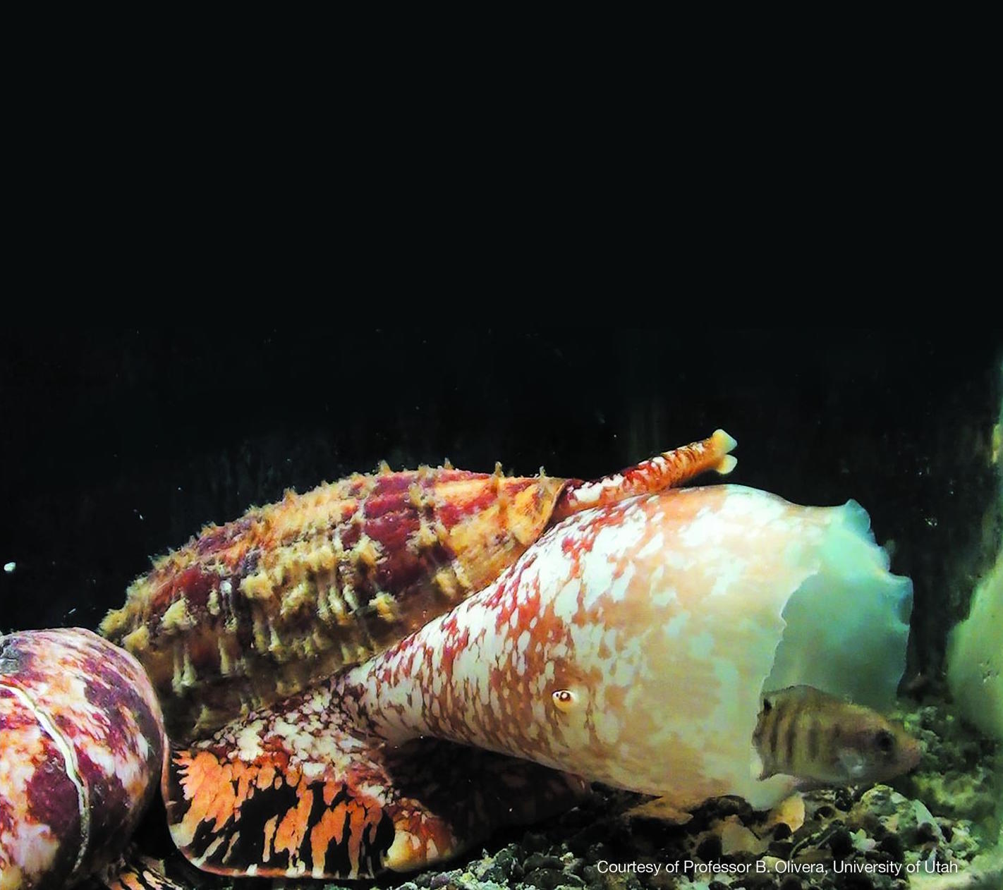 More than 100 species of cone snails use venom to take out fish, often by injecting their prey with venoms that target the nervous system. The geographic cone snail, Conus geographus, uses a different tactic. Last year, the team described how C. geographus and another cone snail have evolved insulins that are more similar to those used by fish (and humans) than by mollusks.