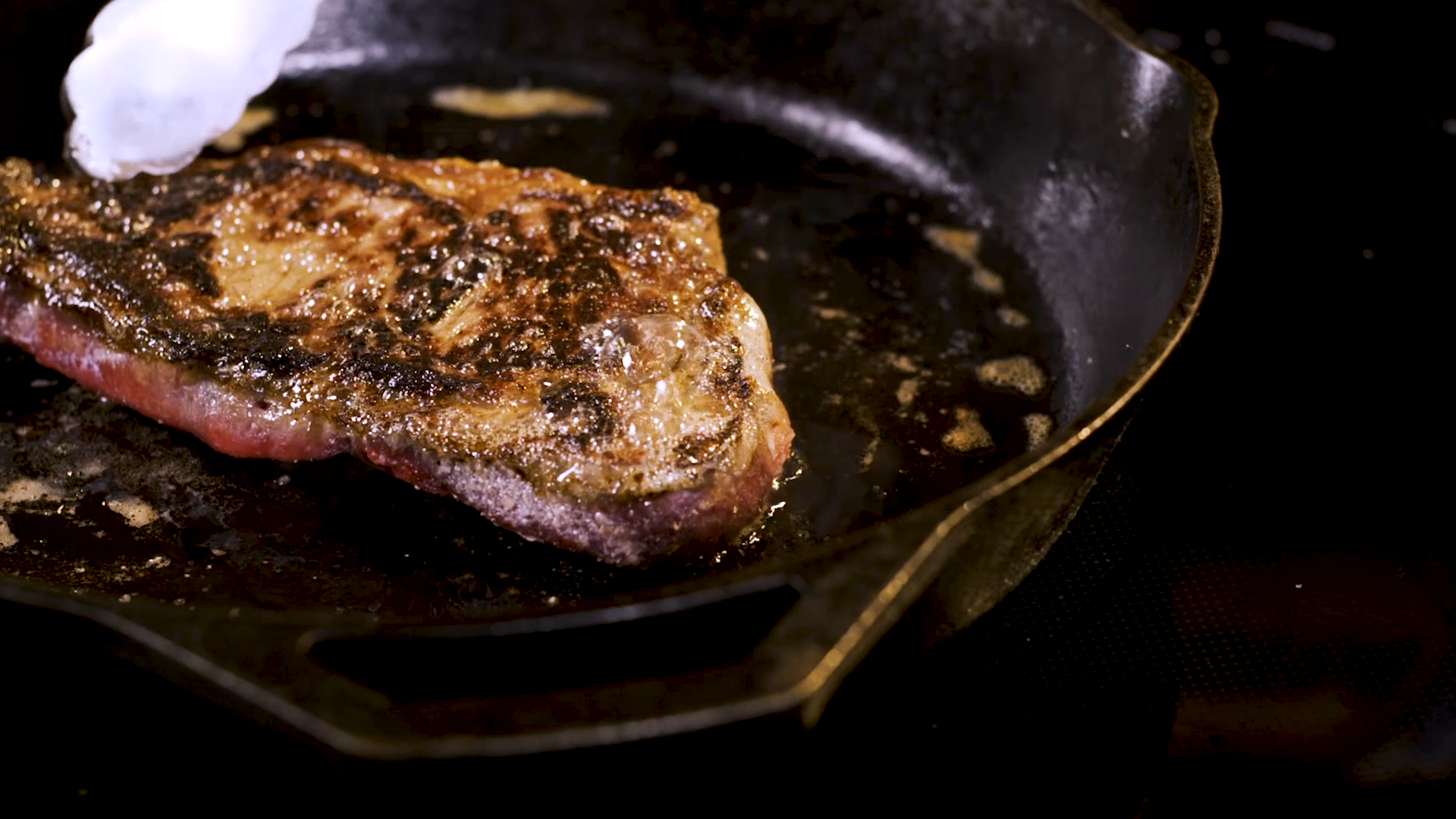 Season the steak with salt and pepper. Don’t bother with any other seasonings because you’ll ruin the final effect. Pan-sear the meat in clarified butter in a cast-iron skillet until it has a nice dark crust, usually for a total of three minutes per side. Be careful: A koji steak caramelizes much faster than a standard one, or even an aged piece of meat.