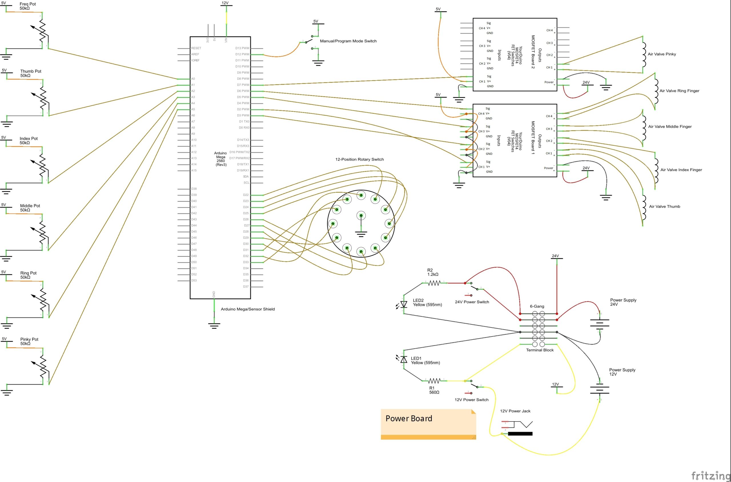 10. Follow the included schematic to wire the six pots, the 12-position switch, and the SPDT switch on the control mounting board. Connect the wires as shown to the Arduino Mega Sensor Shield.