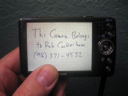 Digital cameras are just the right size to slip out of your pocket on the subway. While aspiring detectives will enjoy trying to track down the rightful owner by identifying restaurant interiors and concert snapshots, it is a lot easier to keep a photo with your phone number on it. I think a handwritten note says it best. Many cameras allow you to lock a photo on the memory card. I recommend locking this one so that it is always your #1 photo and doesn't get cleared like the rest of the photos. This screen would also be a good place to put anything that emergency workers would need, like your blood type, drug allergies or organ donor status. Rob Cockerham