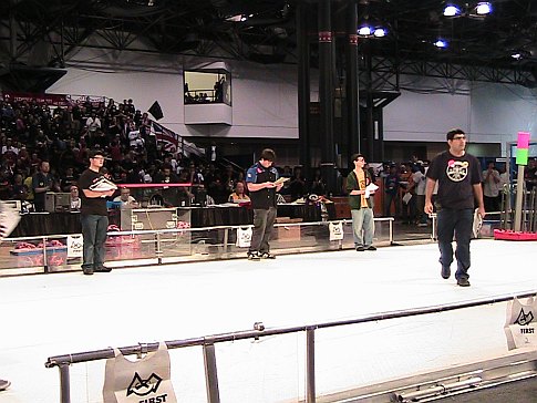 The bouncy MC has already gone over the rules: as in the qualifiers, each alliance will have three teams. That means each team gets two picks. The first-place team can take any team it likes, including one of the other top eight teams. But those teams can decline the invitation if they’d prefer to build their own alliances. The captains in the horseshoe, however, can’t decline. If they do, they can’t accept another offer; they have to sit out entirely. First place wins a spot in the national tournament in the Georgia Dome. Another spot goes to the winner of the competition’s highest honor, the Chairman’s Award. This is an all-around award for engineering, community outreach, encouraging students to choose careers in the sciences, and so forth.
