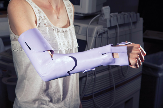 The device has six removable pieces. Two pieces brace the forearm and hand, keeping the broken limb stable. The rest restrict each of the lower arm’s four movements: the bending of the elbow and the up-down, side-to-side and twisting of the wrist. A cast technician assembles the kit by putting the heat-moldable plastic in hot water, shaping the cast around the patient’s arm, and snapping in rivets to fasten the pieces. The application time is about the same as for a standard cast. To take a piece off, doctors just remove its rivets.