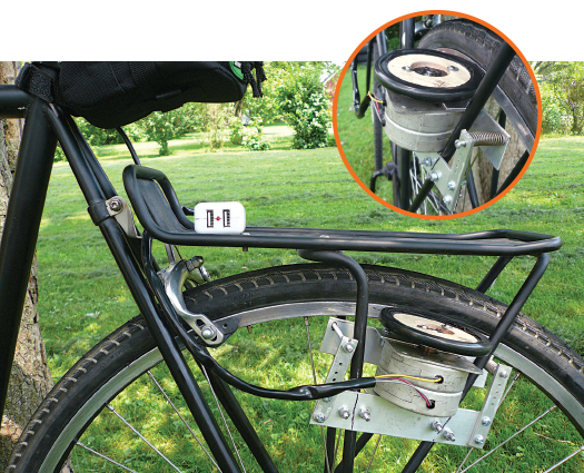 Build a frame to keep the generator’s small wheel in contact with a bike rim. My bike has a rear rack, so I cut a six-inch-long slab of aluminum to span two bars of the rack [see above photo]. I secured the slab under the generator with U-bolts. Next, I cut two 90-degree aluminum angles for the other side of the generator and bolted them to the slab to clamp everything in place. Attach the USB charging port wherever you’d like (I put mine below the seat), and start pedaling for portable power.