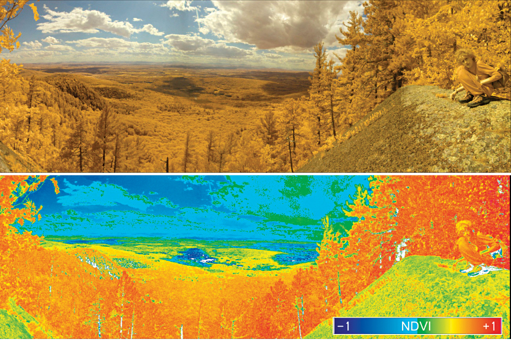 During photosynthesis, leaves soak up blue and red light but reflect invisible near-infrared light. The Infragram blocks red light and—because it’s missing a thin glass filter common to digital cameras—can detect near-infrared light. This way, the camera sees only blue, green, and near-infrared, and Infragram.org can convert the photos into colored maps of photosynthesis. If a farmer attached the Infragram to a drone, for example, he could get a read on his field’s health after a short flight.