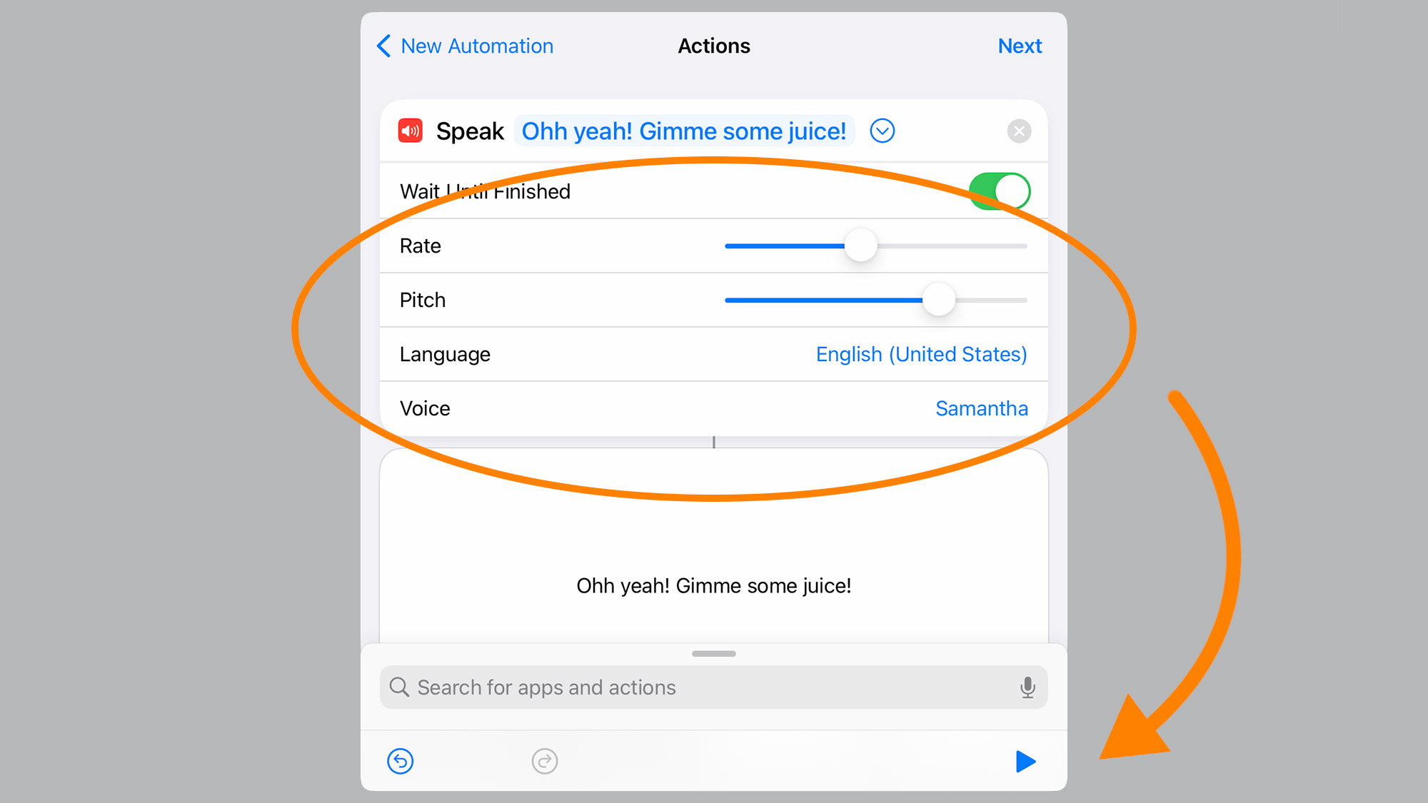 8. Tap the blue arrow to the right of your phrase to further customize the iPhone automation—you’ll be able to choose the pitch, speed, and voice you want your device to use, and even change the language.
