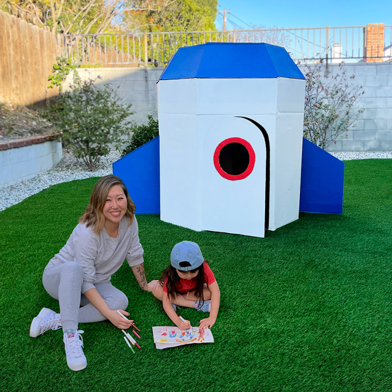 The project was a happy accident. When the family of four had grown out of their two-bedroom place in Hollywood at the end of 2020, they moved to the Valley, where they could spread out. “We finally had a backyard, so the kids were excited,” says Lai. Before even settling in, she got the idea to build a fort out of all the broken-down moving boxes. “It was a great way to reuse them and not just throw them out,” she adds. A few ideas were floated around in the brainstorming phase—mini house? dinosaur?—but everyone voted: They wanted to go to the moon.