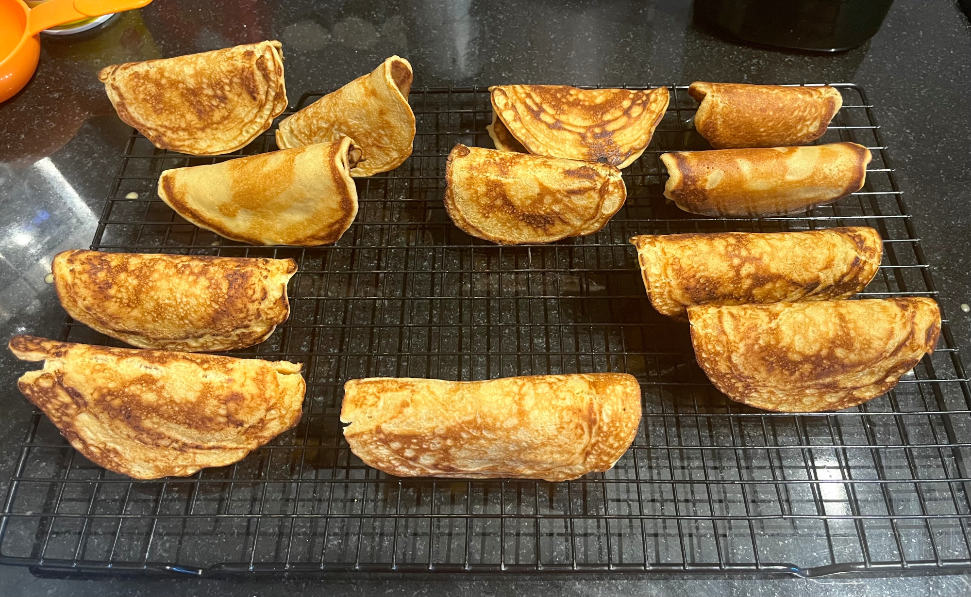 10. Repeat steps 8 and 9 until you’ve used all your batter. You may find your clothesline is too small to hold all your taco shells, but each one should hold its shape fairly well after a minute or two of cooling. You can then move them from the hang-dry line to a traditional cooling rack, but you may need to place them upside down so they retain their shape. You should have around a dozen when you’re done.