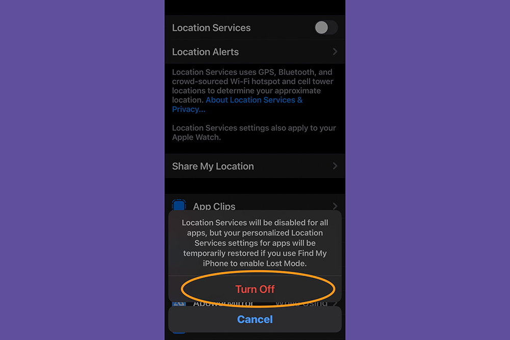 4. Confirm that you want to disable location sharing by tapping Turn Off in the pop-up menu. Turning off Location Services will turn off location sharing for all apps on your iPhone at once.