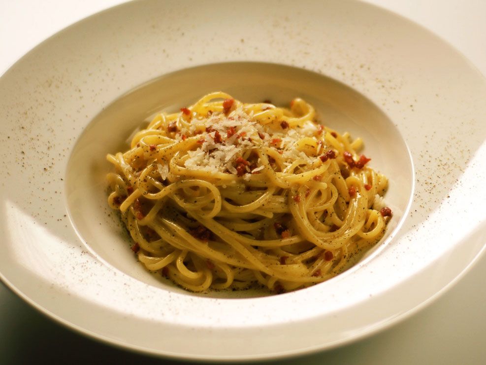 Spaghetti carbonara: Carbonara is the easiest and most delicious meal in the world. Make a pound of spaghetti. Meanwhile, fry a few pieces of pancetta or bacon in a couple tablespoons of olive oil, throwing in 4 to 5 garlic cloves once it starts to crisp up (after 2 to 3 minutes). Scoop up a cup of pasta water before you drain it, then toss the pasta and oily stuff together. Now, beat 2 eggs and stir in a cup of parmesan or similar cheese (I often use asiago). Pour that mixture into the pasta, stirring it constantly (OFF THE HEAT) to prevent the eggs from scrambling as they thicken. Next, use a little bit of the starchy pasta water to thin the sauce until it reaches the thickness of your liking. Season it with salt and pepper, and you’re done. —Rachel Feltman